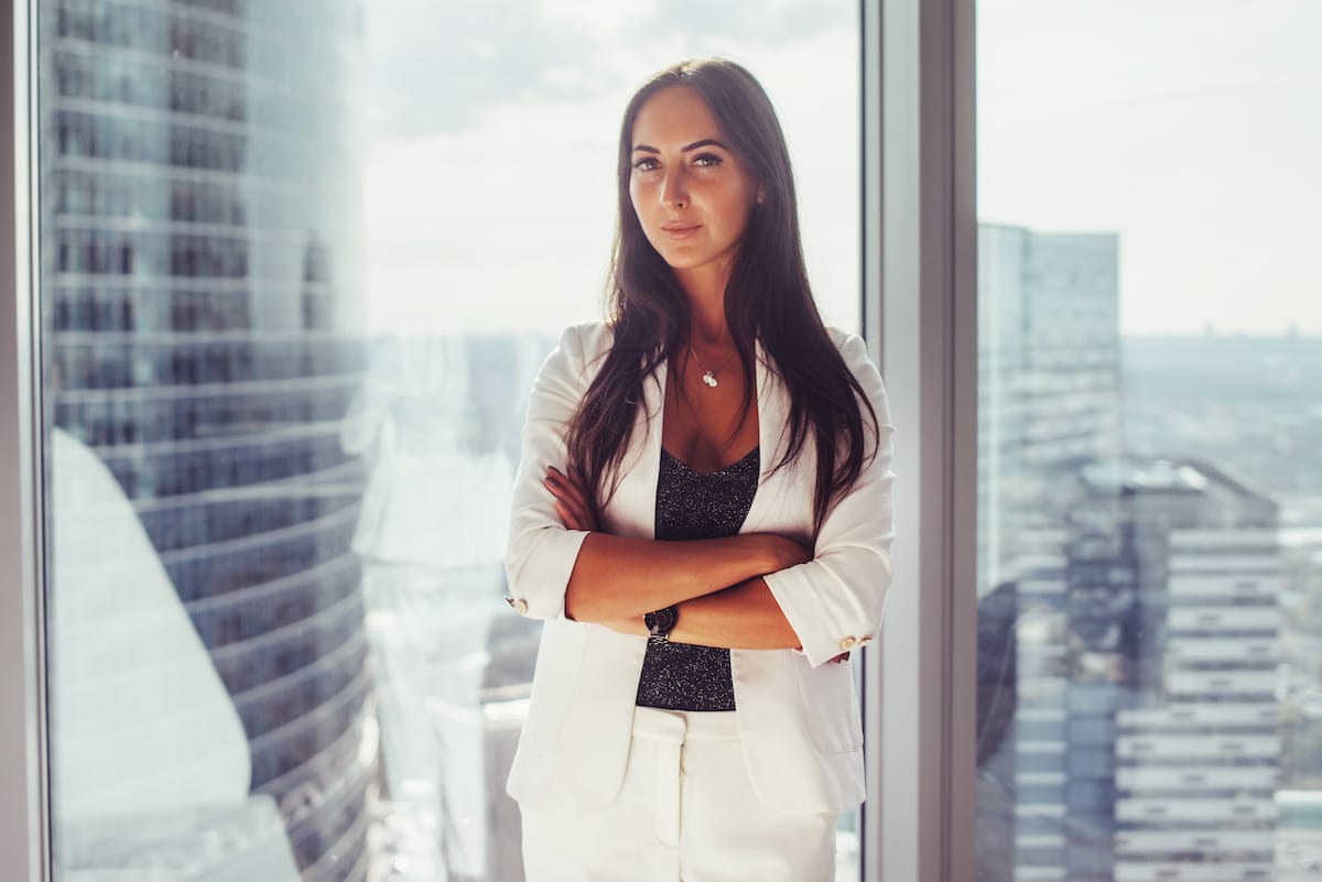 Portrait of elegant business lady wearing white formal suit standing near window looking at camera