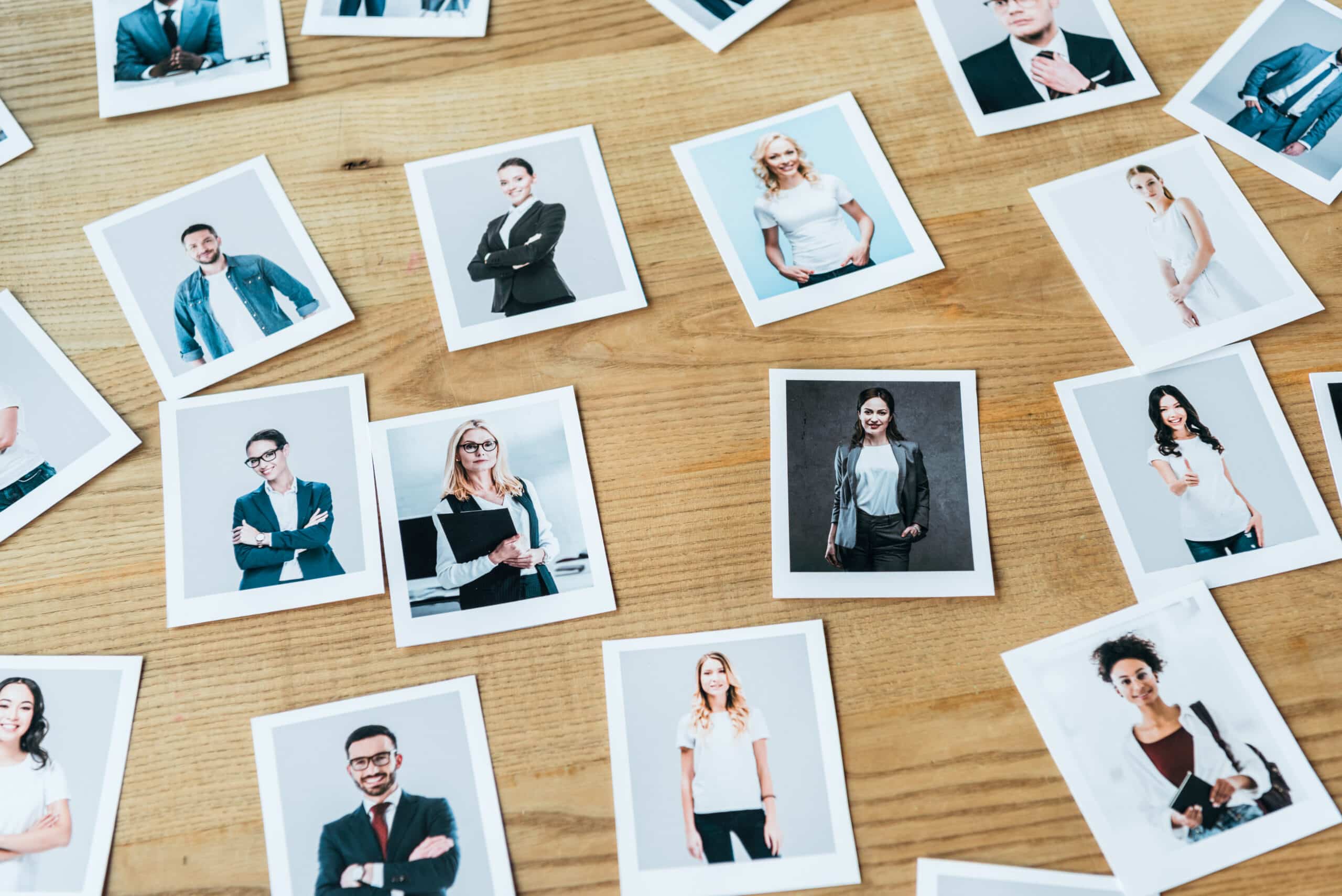 photos with men and women employees on wooden table